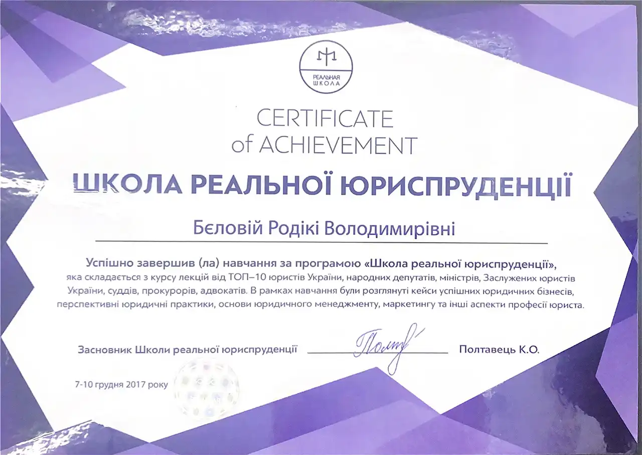 Маю багаторічний досвід у різних галузях права, що дозволяє знаходити ефективні рішення навіть у складних ситуаціях. Гарантую конфіденційність і персоналізований підхід до кожної справи. Постійно вдосконалюю свої знання, щоб запропонувати Вам найкращі юридичні рішення. Працюю оперативно, враховуючи всі деталі, і пропоную зручні формати співпраці – від особистих зустрічей до онлайн-консультацій.